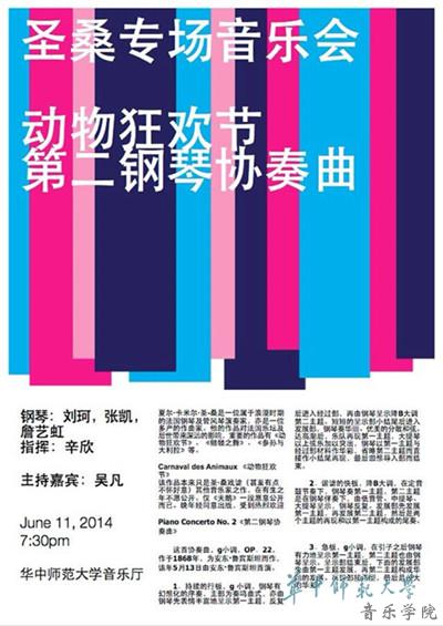 6月11号晚7:30,一场以圣桑作品为主题的音乐会在音乐厅拉开帷幕。此场音乐会由我院钢琴家辛欣教授指挥,吴凡教授主持,在读博士刘珂讲师、张凯副教授、詹艺虹教授,以及院交响乐团的同学们共同演奏完成。音乐会演出的阵容强大,作品选择具有专业性、可听性、趣味性和艺术性,受到同行专家和学生们的好评。专场音乐会由两部大型作品构成,分别是圣桑《g小调第二钢琴协奏曲》和《动物狂欢节》。