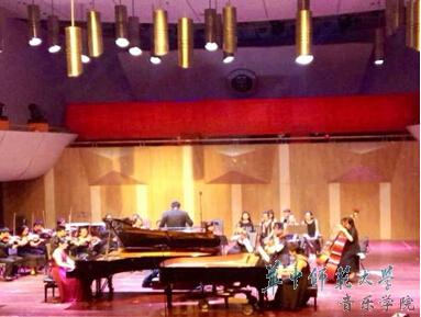第二部分《动物狂欢节》由张凯副教授和詹艺虹教授倾力合作,以双钢琴的演绎形式,把整场音乐会推向顶峰。《动物狂欢节》由十三部标题小曲和终曲组成,描写动物们在热闹的节日行列中,各种滑稽有趣的情形,是一部别出心裁、谐趣横生的双钢琴与管弦乐组曲。两位老师淳熟默契的合作和具有张力的表现,尤其是与管弦乐的共同配合,使听众身临其境,仿佛把人们带入到丛林,那笨拙的大象,灵动的袋鼠,聒噪的公鸡等动物一一浮现眼前,惟妙惟肖地诠释了圣桑笔下不同动物的特定寓意。其间主持人吴凡教授与台上乐手的诙谐互动,为音乐会增添不少乐趣;钢琴家辛欣教授潇洒的指挥风度,更是让在场观众眼前一亮......
